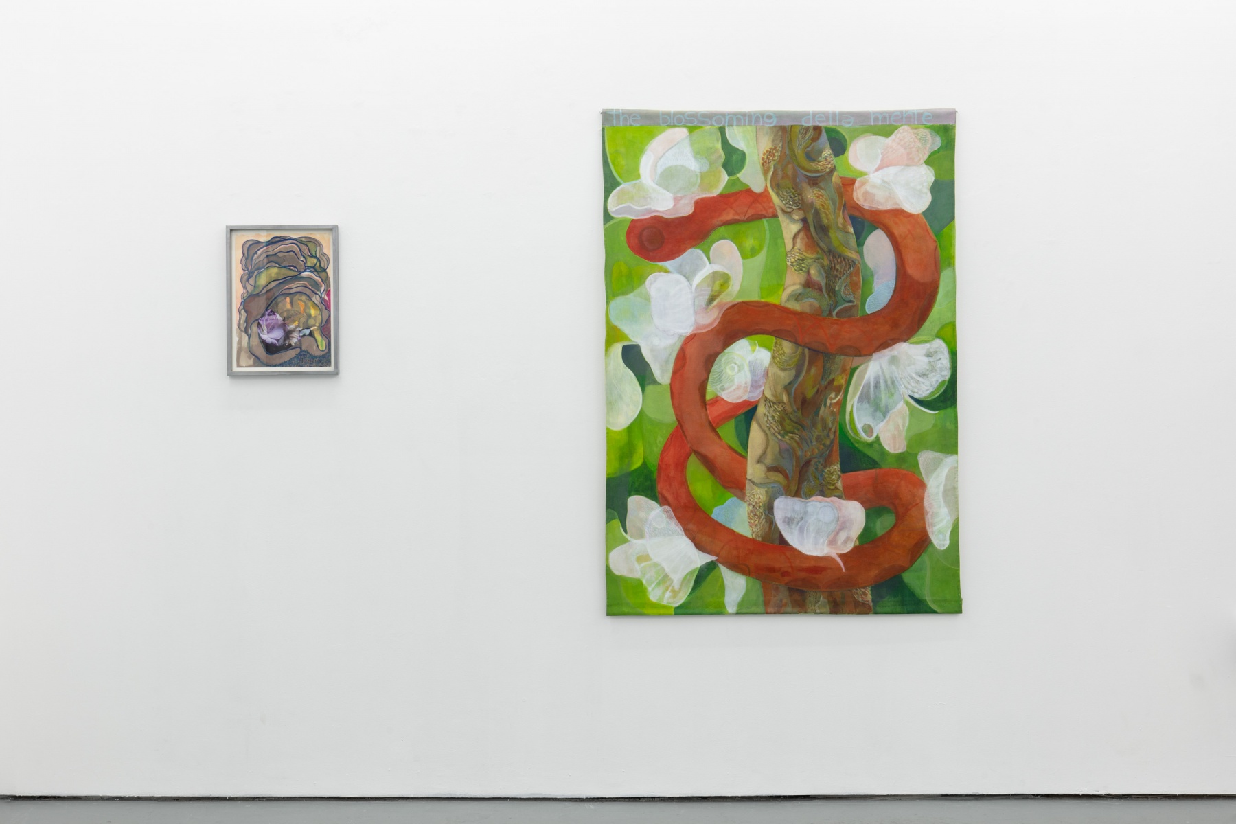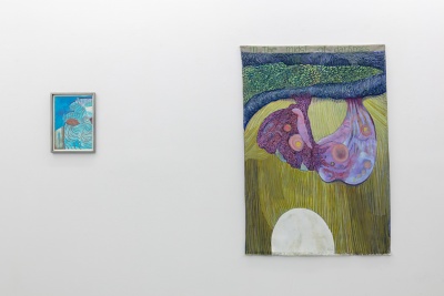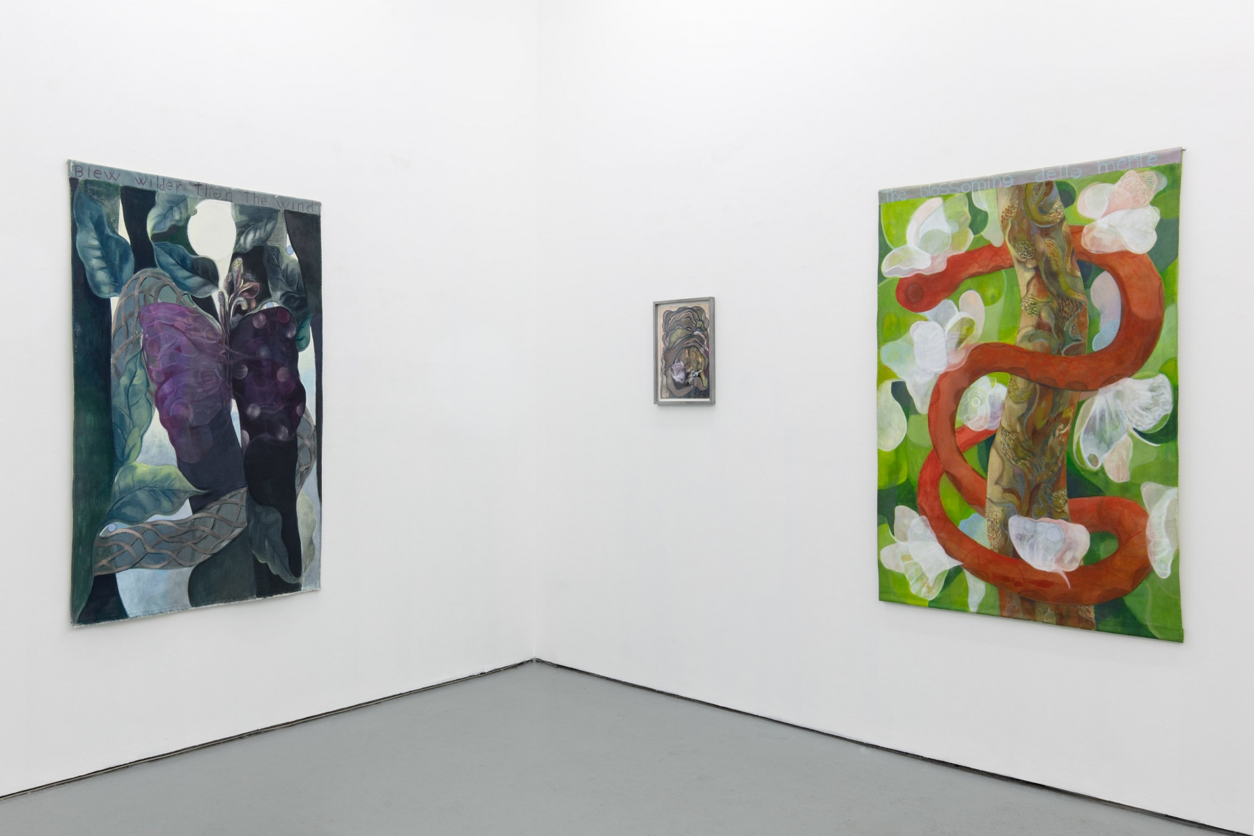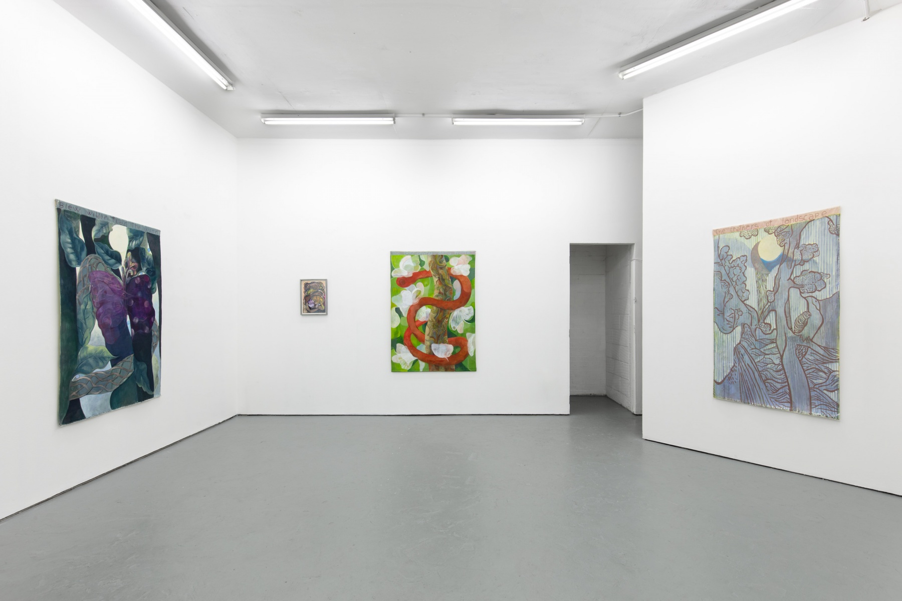 The ground-floor installation forms a protective "cocoon" that may, unexpectedly, evoke a sense of trespassing into a private, forbidden world meant to be kept secret. Towering from the gallery’s irregular walls, these works envelop the viewer in an intimate, organic environment. This organic quality stems from the large, plant-like forms―figures that inhabit the canvas like oversized butterflies, reigning over an eerie, mostly nocturnal underworld. Roma refers to these paintings as "landscapes” which are effectively visualisations of his innermost psychological workings.