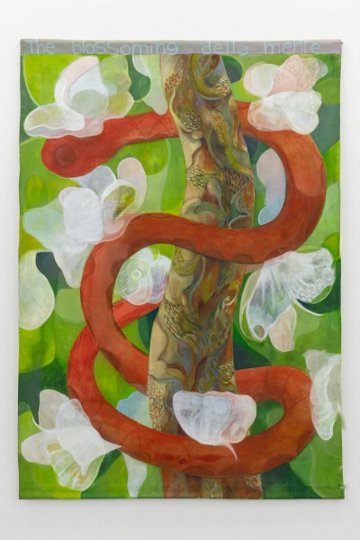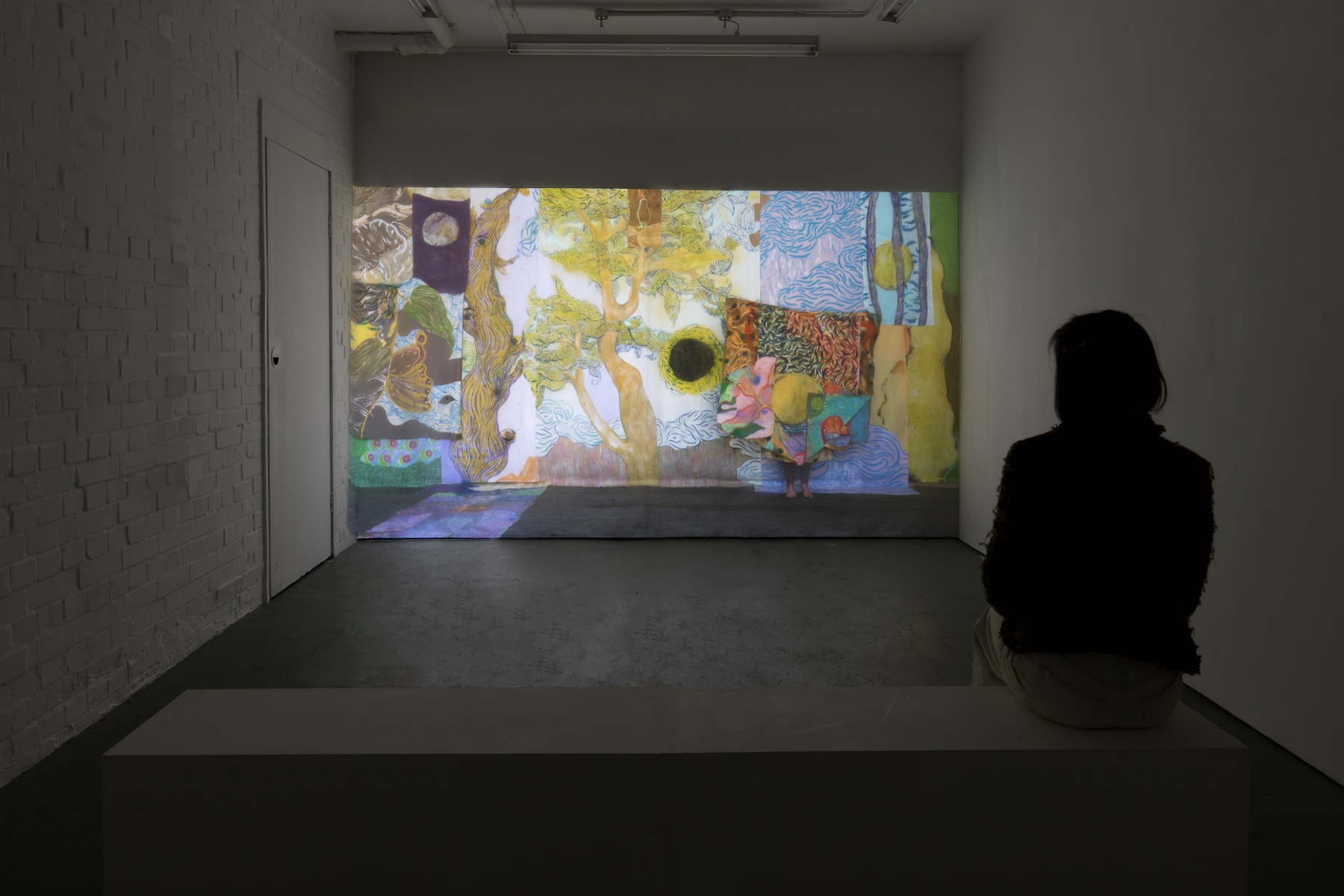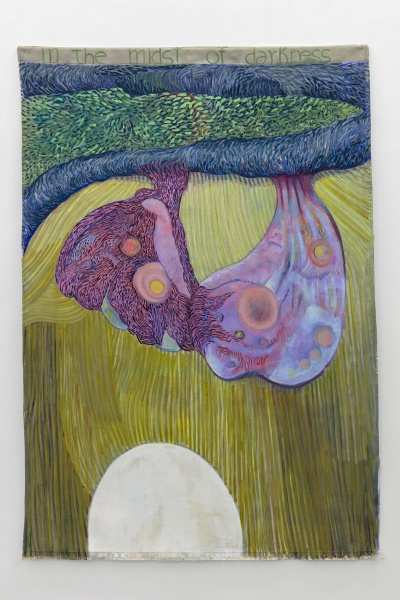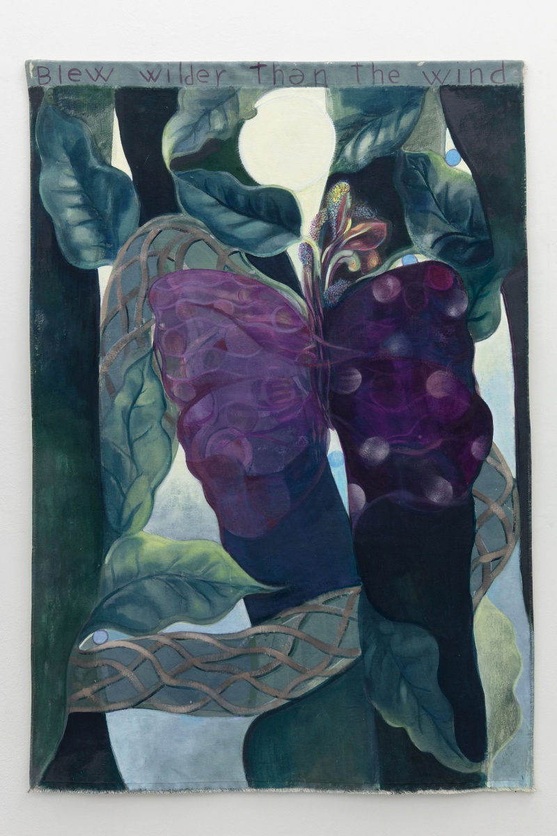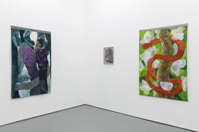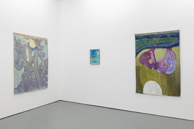 The ground-floor installation forms a protective "cocoon" that may, unexpectedly, evoke a sense of trespassing into a private, forbidden world meant to be kept secret. Towering from the gallery’s irregular walls, these works envelop the viewer in an intimate, organic environment. This organic quality stems from the large, plant-like forms―figures that inhabit the canvas like oversized butterflies, reigning over an eerie, mostly nocturnal underworld. Roma refers to these paintings as "landscapes” which are effectively visualisations of his innermost psychological workings.