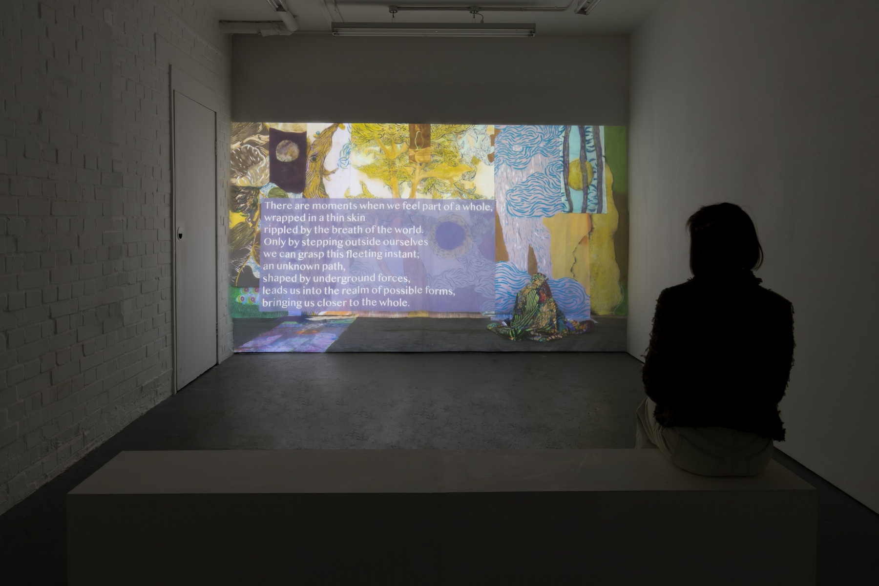 In the basement gallery, the artist debuts his video work, 'La pelle del paesaggio' (The Skin of the Landscape). In this experimental piece, Roma pushes his concept to the extreme, aligning his metaphysical universe with the physical natural world. Across five movements―Mountain, River, Tree, Sun, and Root―a performer animates the paintings of Roma’s intimate world, depicting the struggle and joy of existing as "part of the whole." Accompanied by the original music of Guillermo Lago for saxophone (Caroline Halleck) and choir ( Groupe Vocale Viriditas), the work takes on the allure of a chamber opera. It serves as a reminder that nature is the most grandiose theatre of all, and that the mind constantly assimilates the environments we inhabit.
